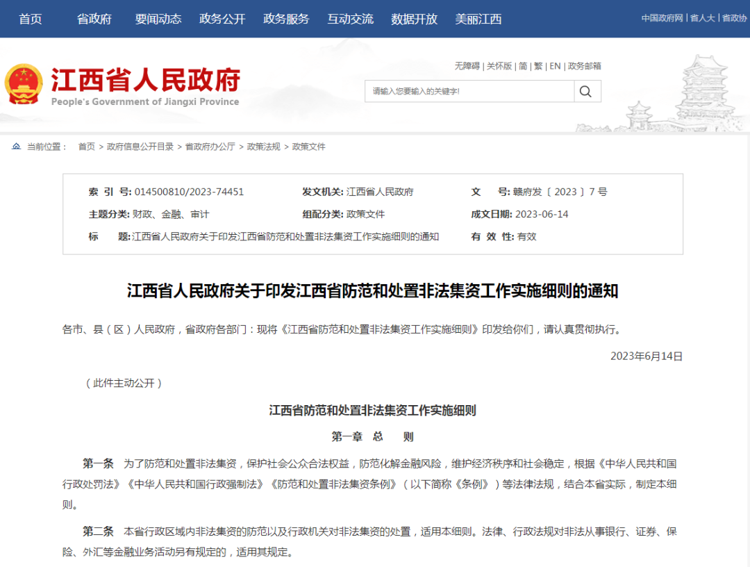 江西省人民政府關(guān)于印發(fā)江西省防范和處置非法集資工作實施細(xì)則的通知