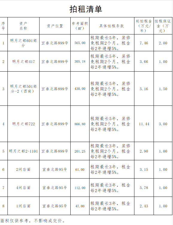 一、拍租標的:宜春北路899號明月之都部分房產(chǎn)、宜春北路95號一樓店面,詳情見本公司拍租清單。