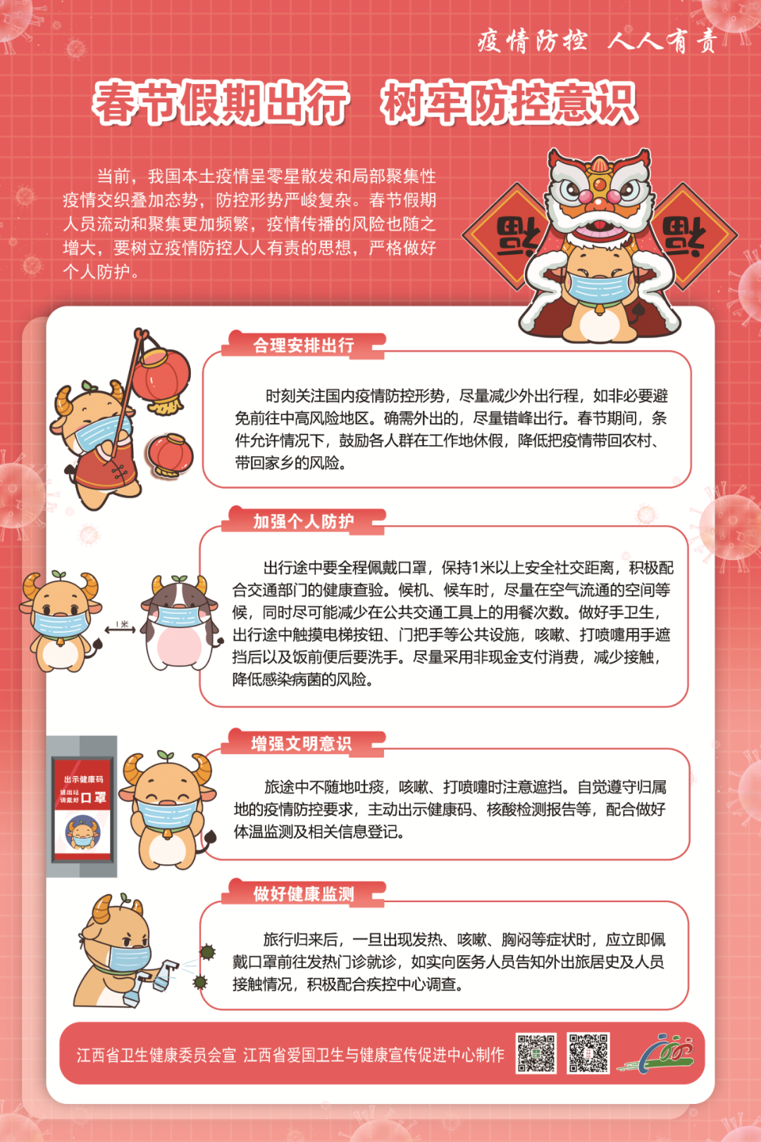 二、引導(dǎo)省外贛籍人員盡量在工作地或居住地過春節(jié),盡可能減少遠距離流動。廣大群眾盡量減少走親訪友,提倡網(wǎng)上拜年、短信祝福。老年人、慢性病患者、孕婦盡量不旅游出行。