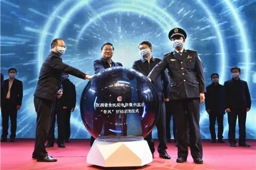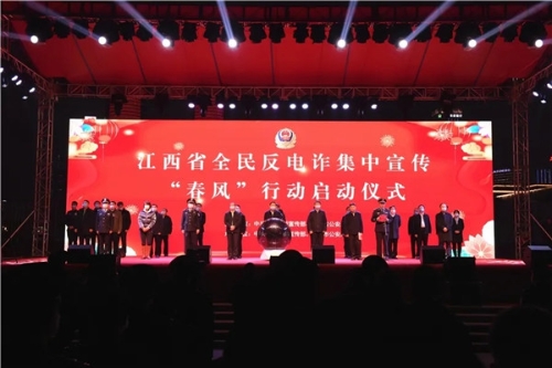 2月9日晚20時(shí),省委宣傳部、省公安廳在南昌市秋水廣場舉行江西省全民反電詐集中宣傳“春風(fēng)”行動啟動儀式。副省長、公安廳長秦義出席儀式并下達(dá)啟動命令,儀式由省政府副秘書長吳龍強(qiáng)主持,公安部督導(dǎo)組成員、省委宣傳部副部長吳永明,南昌市委副書記、市政府黨組書記萬廣明出席儀式。省公安廳黨委委員、南昌市副市長、市公安局長萬秀奇,省公安廳黨委委員、副廳長、廳際聯(lián)席會議召集人胡滿松出席儀式并講話。江西省打擊治理電信網(wǎng)絡(luò)新型違法犯罪成員單位的負(fù)責(zé)同志、省公安廳在昌廳領(lǐng)導(dǎo)、廳直各單位主要負(fù)責(zé)人,南昌市委宣傳部、市委政法委、市檢、法主要負(fù)責(zé)人,中央和省市各大新聞媒體記者、南昌市干部群眾代表共400余人參加儀式。全省市縣兩級黨委宣傳部門、公安機(jī)關(guān)設(shè)立110個(gè)分會場,同步舉行“春風(fēng)”行動啟動儀式。