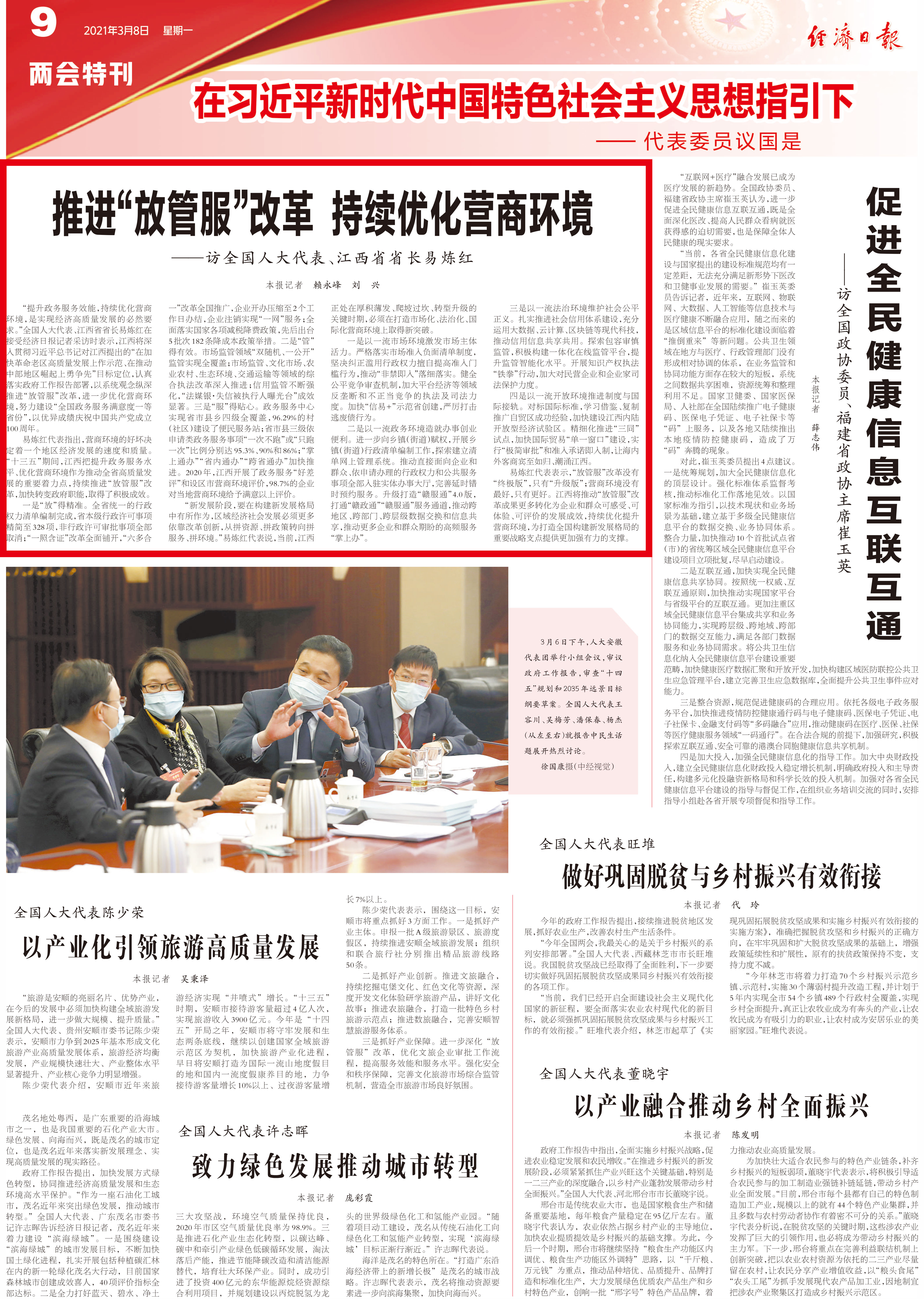 “提升政務服務效能,持續(xù)優(yōu)化營商環(huán)境,是實現經濟高質量發(fā)展的必然要求?!比珖舜蟠?、江西省省長易煉紅在接受經濟日報記者采訪時表示,江西將深入貫徹習近平總書記對江西提出的“在加快革命老區(qū)高質量發(fā)展上作示范、在推動中部地區(qū)崛起上勇爭先”目標定位,認真落實政府工作報告部署,以系統(tǒng)觀念縱深推進“放管服”改革,進一步優(yōu)化營商環(huán)境,努力建設“全國政務服務滿意度一等省份”,以優(yōu)異成績慶祝中國共產黨成立100周年。易煉紅代表指出,營商環(huán)境的好壞決定著一個地區(qū)經濟發(fā)展的速度和質量?!笆濉逼陂g,江西把提升政務服務水平、優(yōu)化營商環(huán)境作為推動全省高質量發(fā)展的重要著力點,持續(xù)推進“放管服”改革,加快轉變政府職能,取得了積極成效。