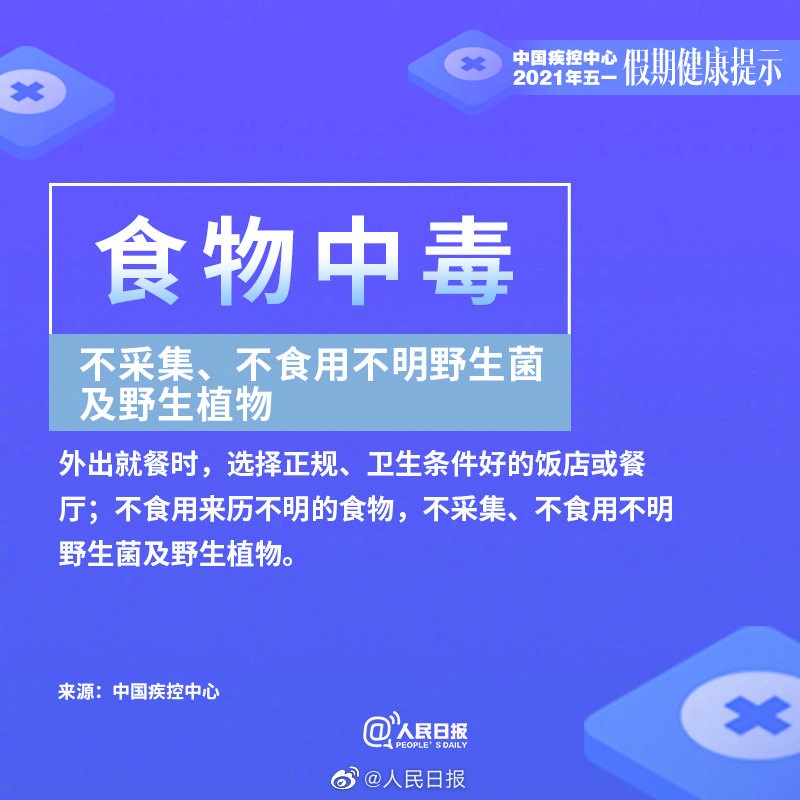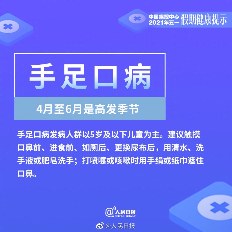 “五一”假期臨近,中國疾病預(yù)防控制中心通過官方微信公眾號發(fā)布健康提示,建議重點做好新冠肺炎、諾如病毒腸炎、手足口病、蜱傳播疾病、動物傳播疾病和食物中毒的預(yù)防與防范。