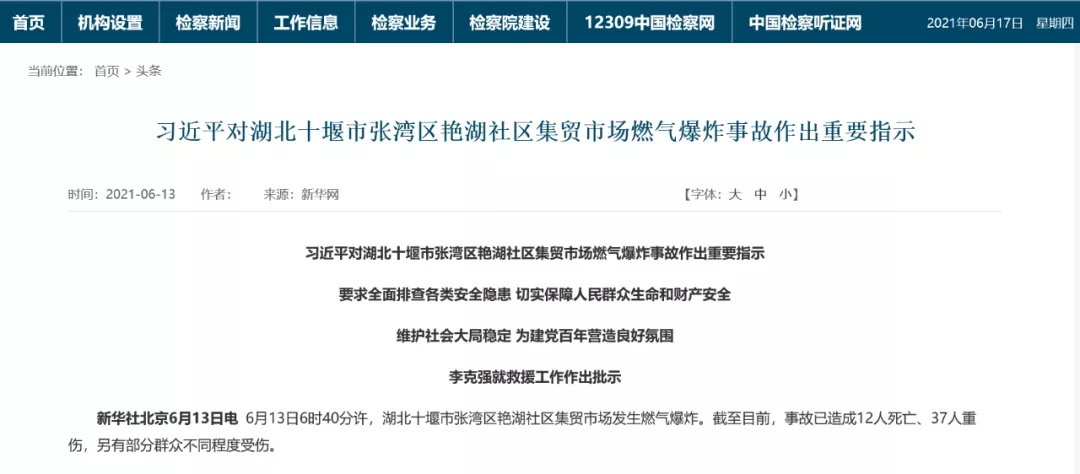 中共中央總書記、國(guó)家主席、中央軍委主席習(xí)近平立即作出重要指示,湖北十堰市燃?xì)獗ㄊ鹿试斐芍卮笕藛T傷亡,教訓(xùn)深刻!要全力搶救傷員,做好傷亡人員親屬安撫等善后工作,盡快查明原因,嚴(yán)肅追究責(zé)任。習(xí)近平強(qiáng)調(diào),近期全國(guó)多地發(fā)生生產(chǎn)安全事故、校園安全事件,各地區(qū)和有關(guān)部門要舉一反三、壓實(shí)責(zé)任,增強(qiáng)政治敏銳性,全面排查各類安全隱患,防范重大突發(fā)事件發(fā)生,切實(shí)保障人民群眾生命和財(cái)產(chǎn)安全,維護(hù)社會(huì)大局穩(wěn)定,為建黨百年?duì)I造良好氛圍。
