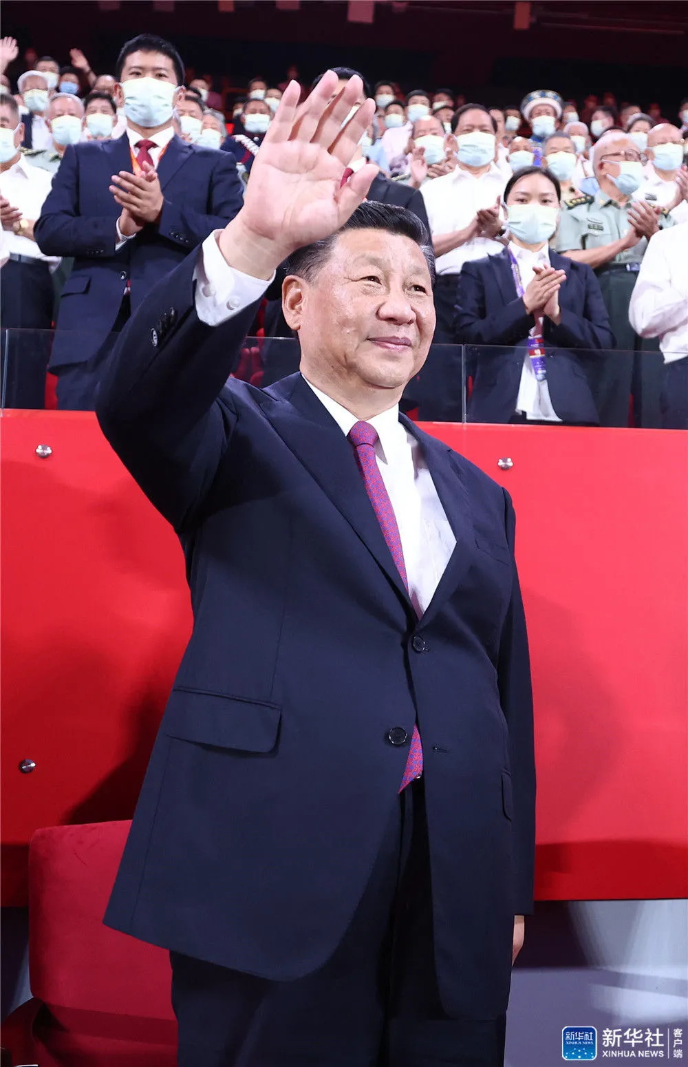 19時57分許,在歡快的樂曲聲中,習近平等領導同志走上主席臺,向大家揮手致意,全場響起熱烈的掌聲和歡呼聲。