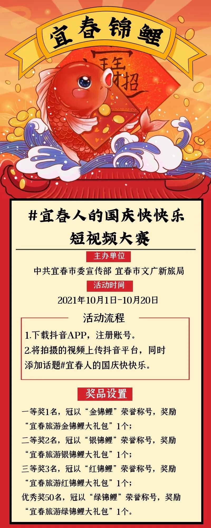 點擊文章底部“寫留言”,說說你的國慶出游計劃,如“我們一家國慶準備去靖安中源鄉(xiāng)避暑”,并分享你的推薦理由,同時將文章鏈接分享到朋友圈。我們將陸續(xù)從中選取99條精彩留言進入精選,截至10月5日21:00,獲贊最高的留言將被授予“宜春旅游金錦鯉”榮譽稱號,并獎勵金錦鯉大禮包一份。