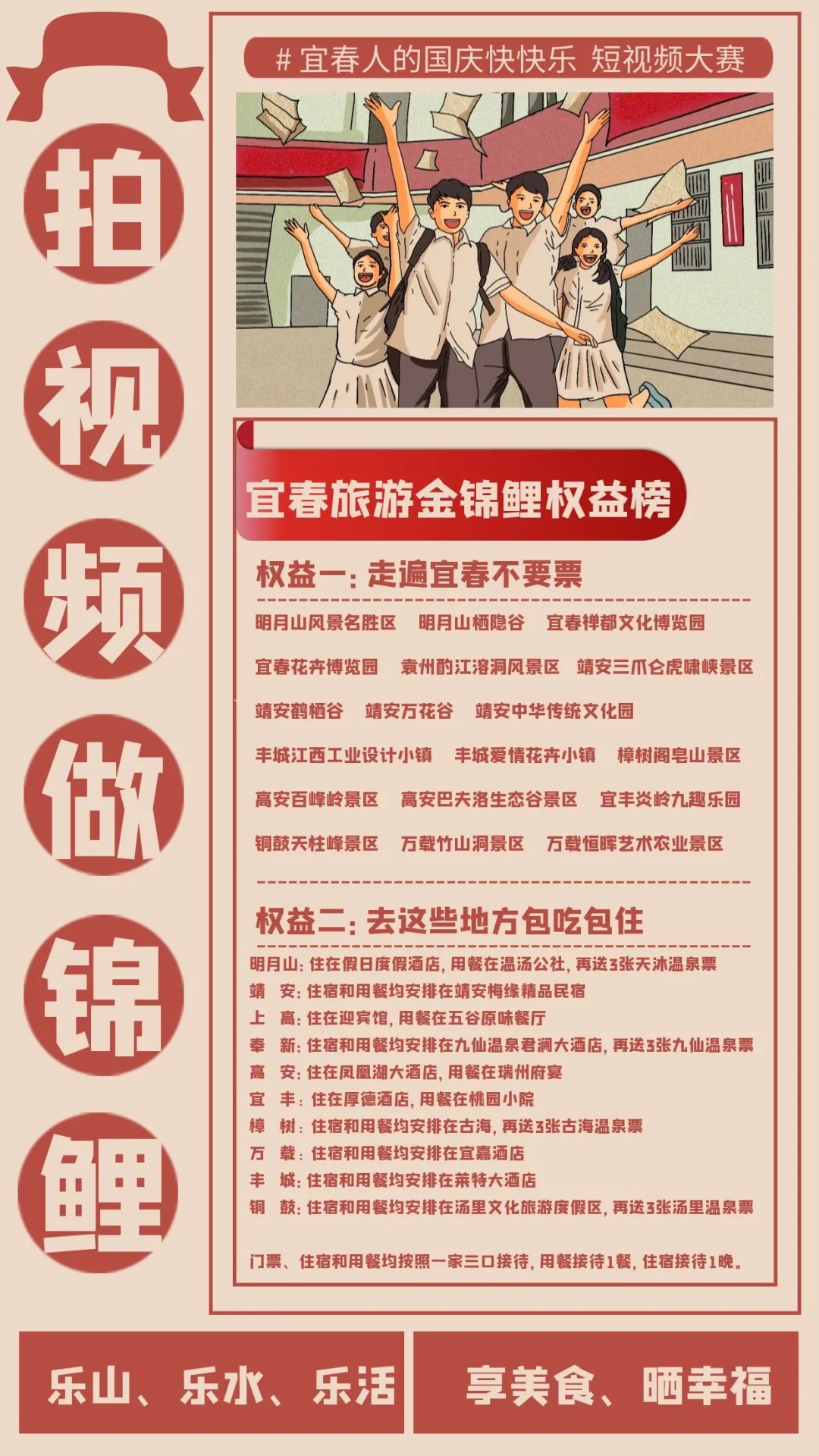 1.參賽作品要契合“樂山、樂水、樂活、享美食、曬幸?!敝黝},展現(xiàn)宜春人國慶假期的多種快樂打開方式。
