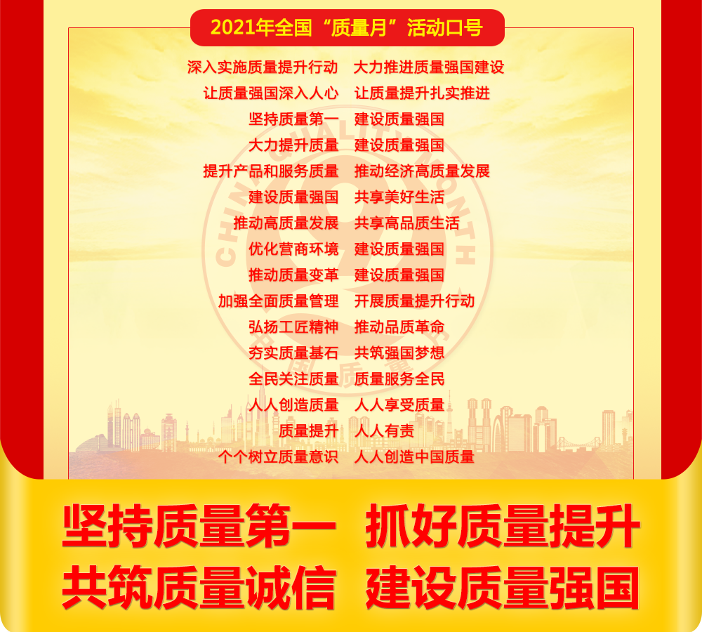 攜手同心齊奮斗,共圓質(zhì)量強(qiáng)國夢。中國航天科技集團(tuán)、重慶紅九九食品、名臣健康用品、海爾、格力等1600余家企業(yè),作為各行業(yè)、各區(qū)域質(zhì)量管理水平較高并在質(zhì)量提升方面具有良好示范帶頭作用的代表,以“堅持質(zhì)量第一,抓好質(zhì)量提升,共筑質(zhì)量誠信,建設(shè)質(zhì)量強(qiáng)國”為主題,聯(lián)合發(fā)出《2021年全國“質(zhì)量月”企業(yè)質(zhì)量誠信倡議書》,倡議企業(yè)界立足新發(fā)展階段、貫徹落實新發(fā)展理念、構(gòu)建新發(fā)展格局、維護(hù)公平競爭、促進(jìn)共同富裕、推進(jìn)高質(zhì)量發(fā)展,深入開展質(zhì)量提升行動,匯聚力量推進(jìn)質(zhì)量社會共治。