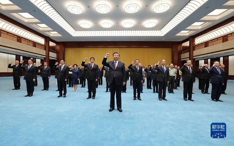 2021年6月18日,黨和國(guó)家領(lǐng)導(dǎo)人習(xí)近平、李克強(qiáng)、栗戰(zhàn)書、汪洋、王滬寧、趙樂際、韓正、王岐山等在中國(guó)共產(chǎn)黨歷史展覽館參觀“‘不忘初心、牢記使命’中國(guó)共產(chǎn)黨歷史展覽”。這是參觀結(jié)束后,習(xí)近平帶領(lǐng)黨員領(lǐng)導(dǎo)同志一起重溫入黨誓詞。