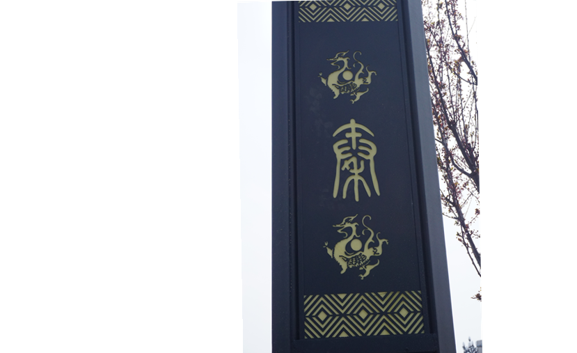 燈桿底座刻有篆體“秦”“漢”的字樣,上下圖案為秦漢時期瓦當(dāng)四神獸圖案,上下條紋為秦磚圖案提煉而來。