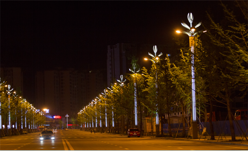芙蓉中華燈以“芙蓉”為設(shè)計元素,采用花瓣的形式,實現(xiàn)了燈桿與燈頭的實體連接。燈具以城市照明華燈造型為根基,在原有景觀照明基礎(chǔ)上,增加了功能照明,使功能照明和景觀照明完美結(jié)合,且顯示出燈型的華麗時尚,營造出一幅“華燈耀營山”的美麗景象。