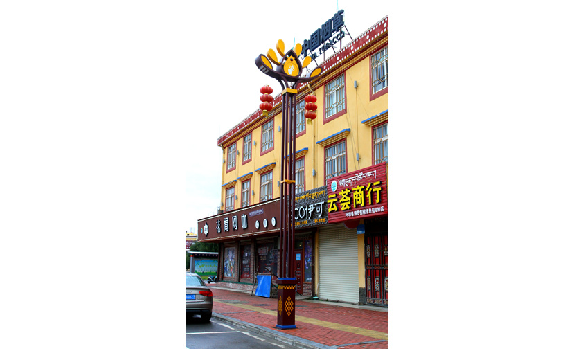 安裝在S209線的“犇?!睙粢愿呱礁吆貐^(qū)特有的珍稀牦牛為設(shè)計元素,牦牛被藏族人民稱為“高原之舟”。設(shè)計者通過燈型主體將牛頭牛角外部輪廓展現(xiàn)出來,塑造了一個栩栩如生、富有力量感和氣勢磅礴的犇牛形象。燈桿中部燈箱絲印臧八寶圖案,內(nèi)置LED光源,愿當?shù)孛癖娂槌T冢鞂俸湍?,所求如愿?