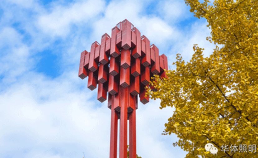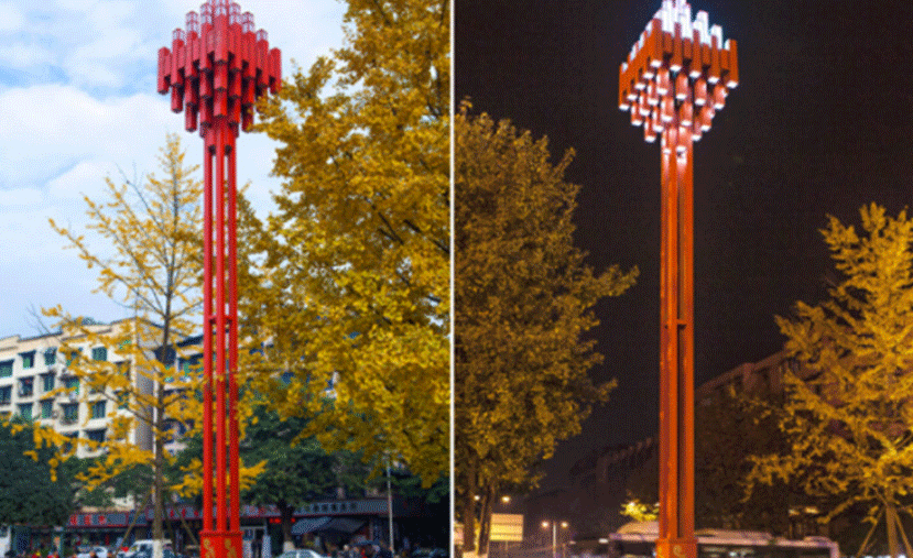 吉祥結,佛教八寶之一,聳立在佛光廣場噴水池的兩側,以挺拔的姿態(tài)守衛(wèi)著市民的安寧。這款燈具以吉祥結造型,同時,立體幾何堆疊的形式又使得峨眉群山的巍峨得以體現(xiàn),在色彩上,選取具有中國特色的紅色,吉慶而祥和,表達對旅博會舉行圓滿的美好祝愿,展示著峨眉這座城市特有的文化魅力。