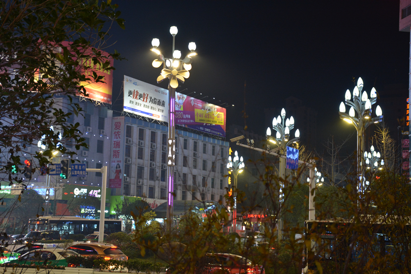 改造中使用的路燈,皆攫取了這一系列的元素,通過工業(yè)設計加工,形成了一盞盞頗具審美價值的道路燈,讓市民好不贊嘆。如玉蘭燈的燈桿上加入了吹蘆笙的小伙兒和斗牛的圖案式文化符號;牡丹棲鳳的燈頭設計為“鳥宿牡丹”的造型,將燈桿底座設計為苗族人日常生活中頻繁接觸的花瓶狀,并在燈桿底座加上茶花圖案,如同綻放的牡丹,寓意盛大繁榮、生機勃勃之意; “金孺?!薄ⅰ暗怼敝苯右院团W鳛樵?,進行設計,讓燈頭看上去如同一只蝴蝶在綻放光芒、翩翩起舞,或如同牛角在奮力拼搏,追逐勝利,贏在未來……
