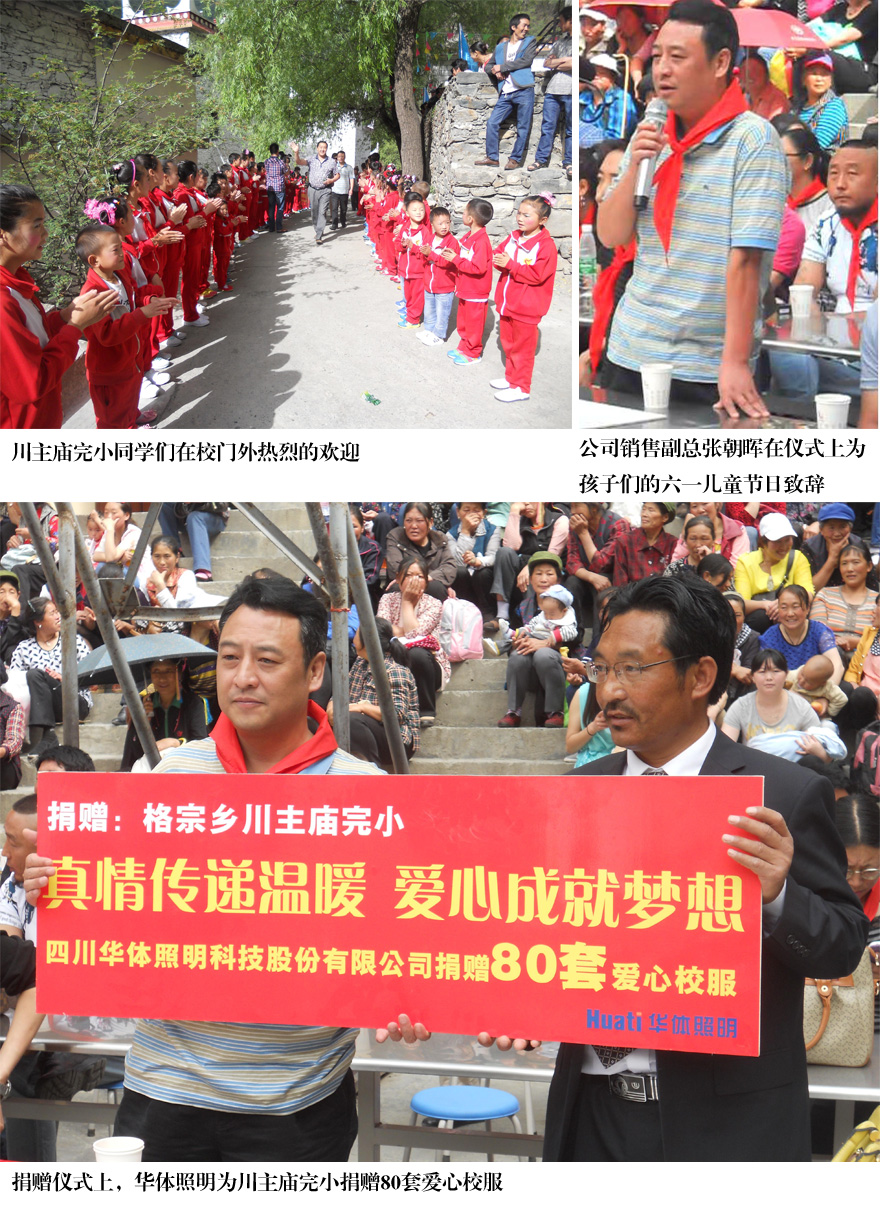 5月30日,四川華體照明科技股份有限公司銷售副總張朝暉一行來到四川省丹巴縣格宗鄉(xiāng)絨壩溝的川主廟完小,與該校同學(xué)們共同慶?!傲粐H兒童節(jié)”,并為該校學(xué)生送去了華體的愛心——捐贈80套愛心校服,情暖校園。
