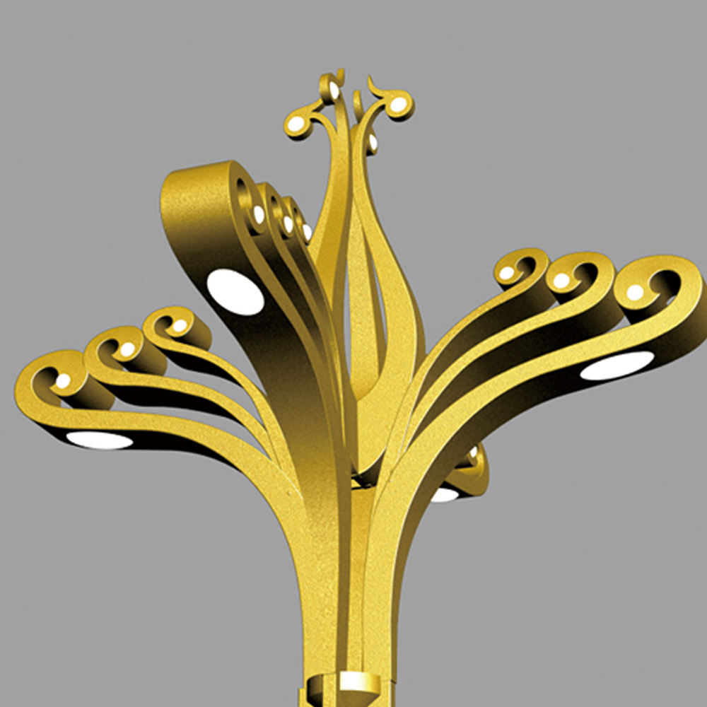 燈型采用中國傳統(tǒng)的四向?qū)ΨQ手法,展現(xiàn)出鳳的高貴與華麗,可謂是“毫光灑風(fēng)雨,紋彩動(dòng)云霓”;