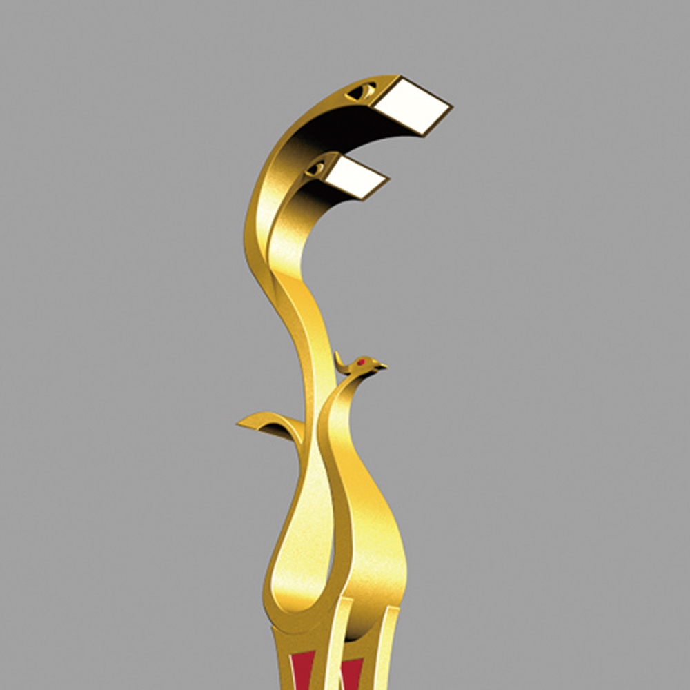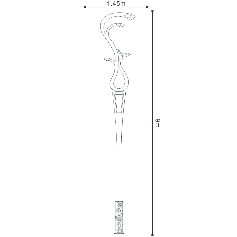 燈型上部為鳳凰的流線簡(jiǎn)化樣式,桿體采用夸張的手法表現(xiàn)鳳凰的腳腿,底座用強(qiáng)烈的對(duì)比方式,以藍(lán)、白相間的“祥云”紋飾來(lái)表現(xiàn)鳳舞九天的藝術(shù)效果;