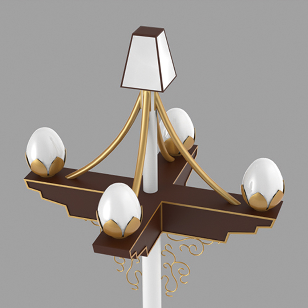 燈罩形似金蓮象征西藏的佛教文化,燈臂象征廟宇,結構整體充滿了西藏獨有的風格,造型突出、結構鮮明、簡潔美觀。