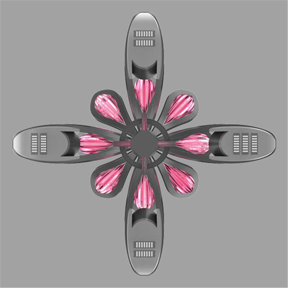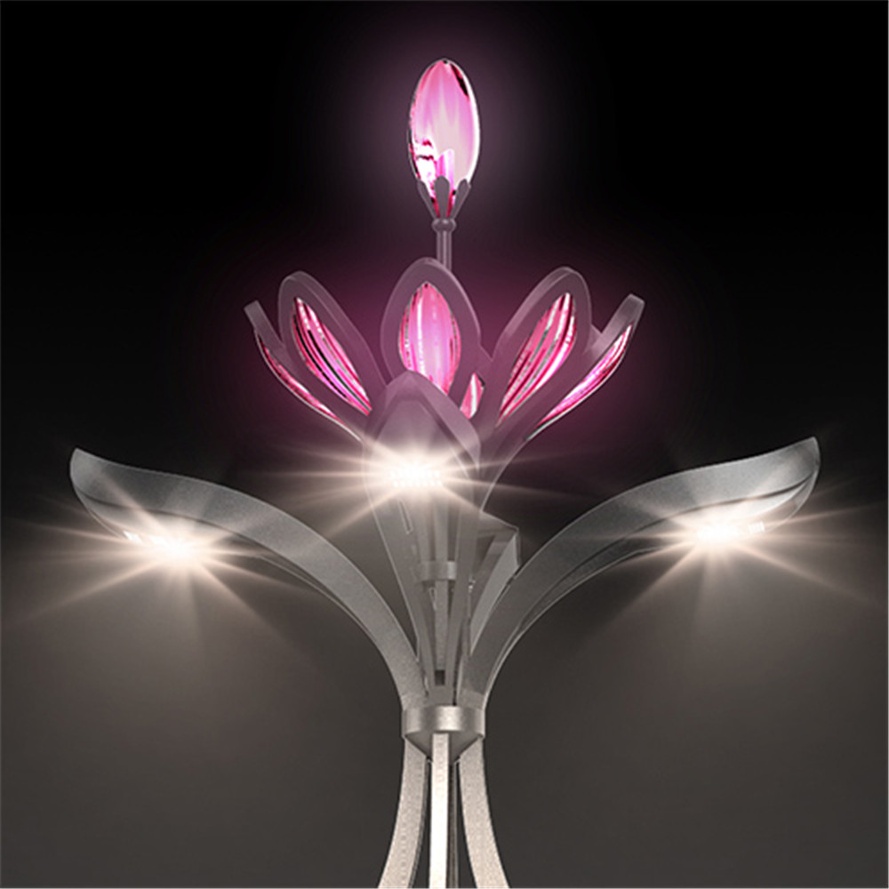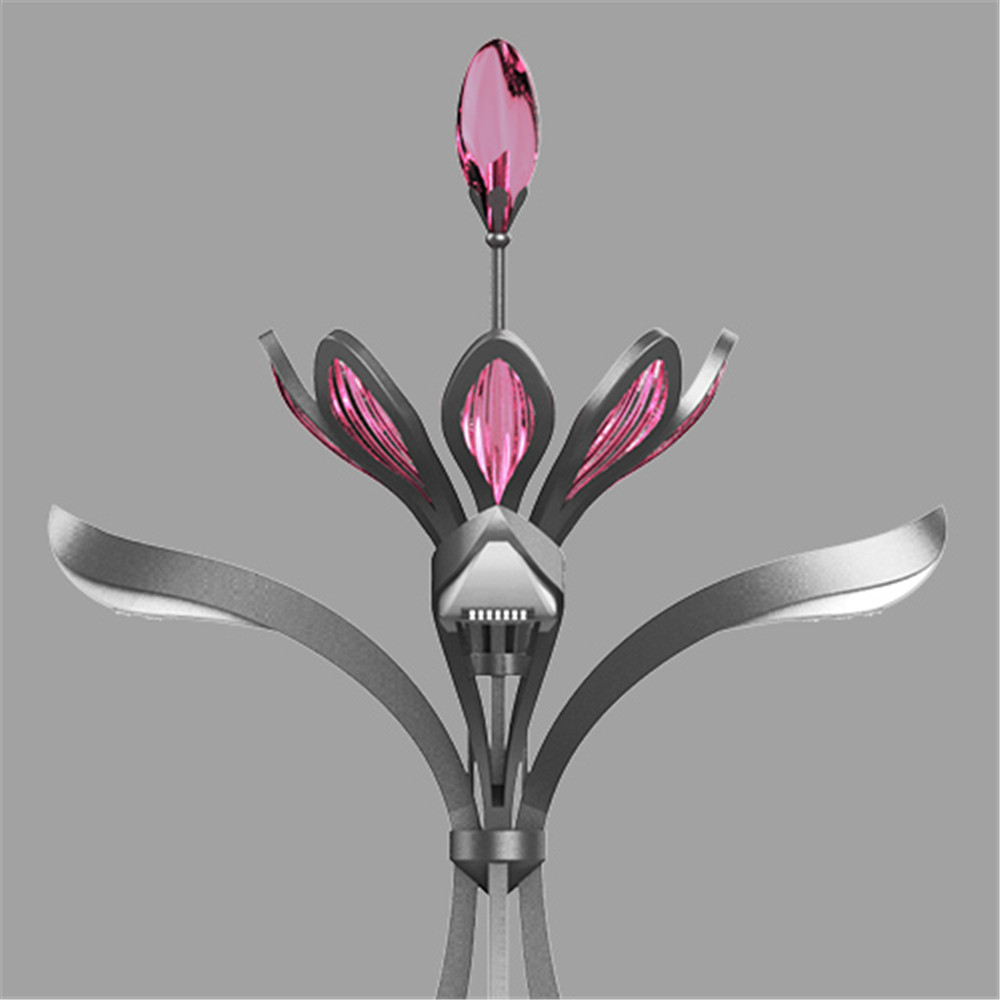 采用山茶花作為設(shè)計(jì)元素,燈桿設(shè)計(jì)成四桿花瓶狀,打破常規(guī)燈桿單一的樣式,主體分為功能照明和裝飾照明兩個(gè)部分,分別對應(yīng)的是山茶花的葉子、花瓣和花蕾,彩色的裝飾玻罩白天具備一定景觀性,和道路綠化景觀的“四季有花賞”的設(shè)計(jì)策略相融合,夜晚呈現(xiàn)山茶花盛世開放的亮麗景致。